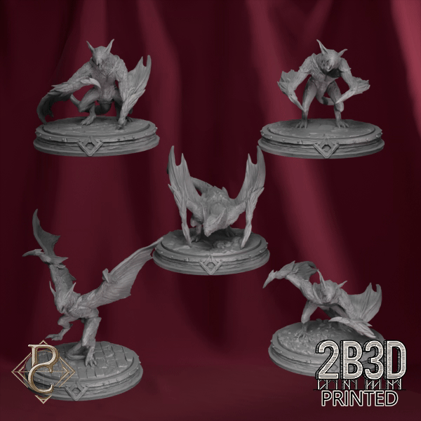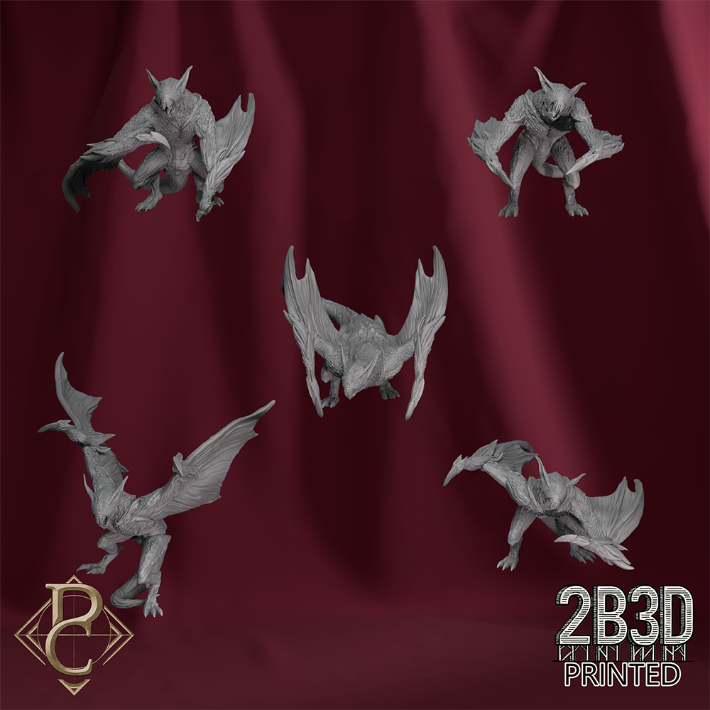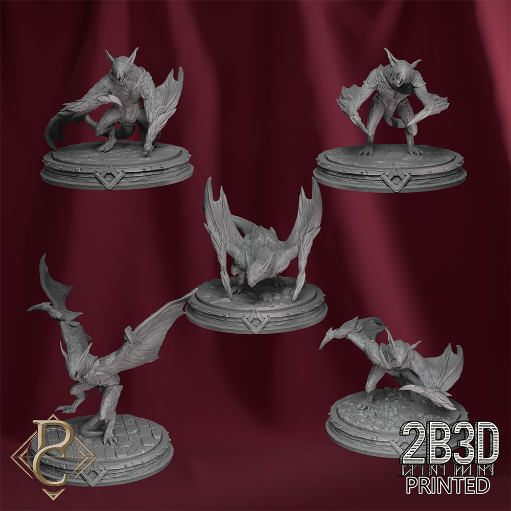 The Chiroptera Swarm is a premium 3D printed miniature set depicting a flight of infernal bat-like creatures, servants of Azghorath’s demonic will. Engineered through blasphemous alchemy, these beasts hunt by sound and shadow, devouring the souls of those who wield magic.