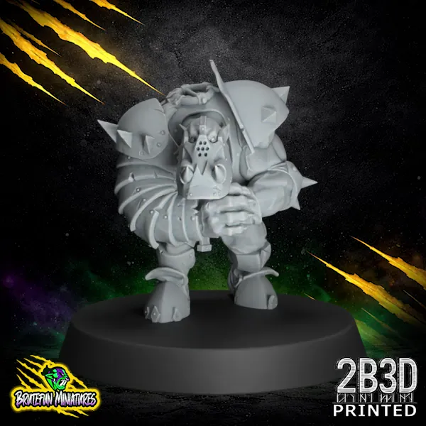The Black Orc Team Blitzer (Bracing) is a 32mm high-detail resin fantasy football miniature from BruteFun Miniatures, professionally printed by 2B3D for coaches who value a rock-solid line of scrimmage. This specific sculpt features a defensive, hunched-over stance with hands clasped, highlighting a unique perforated face mask and heavily reinforced, segmented armor along the right arm. The bulk of the musculature and the intricate mechanical details of the armor plating make it a fantastic project for painters looking to experiment with metallic textures and weathered battle damage. Designed for tabletop performance and aesthetic impact, this resin model provides the premium quality expected of a boutique 2B3D print. Secure this immovable force for your collection and anchor your team’s defense today.