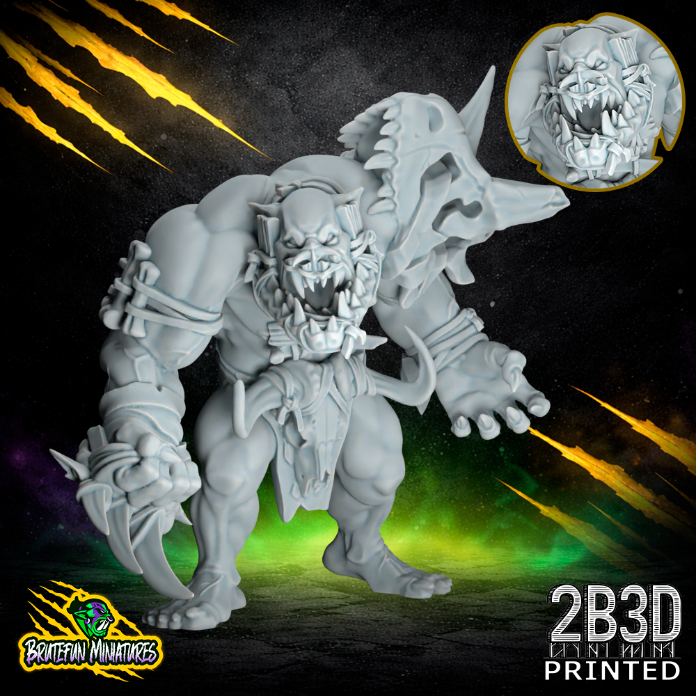 The Savage Orc Brawler 03 is a 32mm high-detail resin fantasy football miniature from BruteFun Miniatures, professionally printed by 2B3D for the Savage Orcs team. This sculpt portrays a massive, grounded warrior built for holding the line of scrimmage against the toughest opponents. The character is detailed with flint-knapped stone gauntlets, lethal bone spikes, and a heavy bone trophy lashed to the back. To allow for diverse team builds and individual player identification, this model is available in four distinct variations: Jaw with Piercing, Jaw with No Piercing, No Jaw with Piercing, and No Jaw with No Piercing. The sharp muscle definition and rich textures of skin, stone, and bone make this an exceptional canvas for hobbyists and professional painters alike. Whether you are expanding your Savage Orcs roster or seeking a centerpiece for your display cabinet, this 2B3D boutique print delivers the high-fidelity detail your collection deserves.