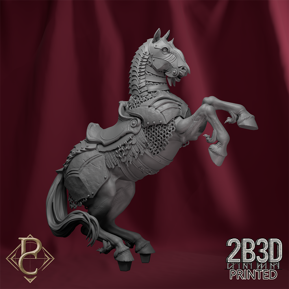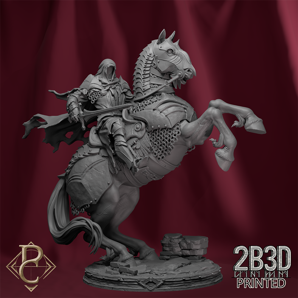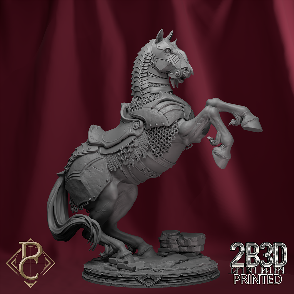 The sculpt captures motion, dominance, and cruelty, blending intricate armor detailing with the raw energy of the horse’s stance.