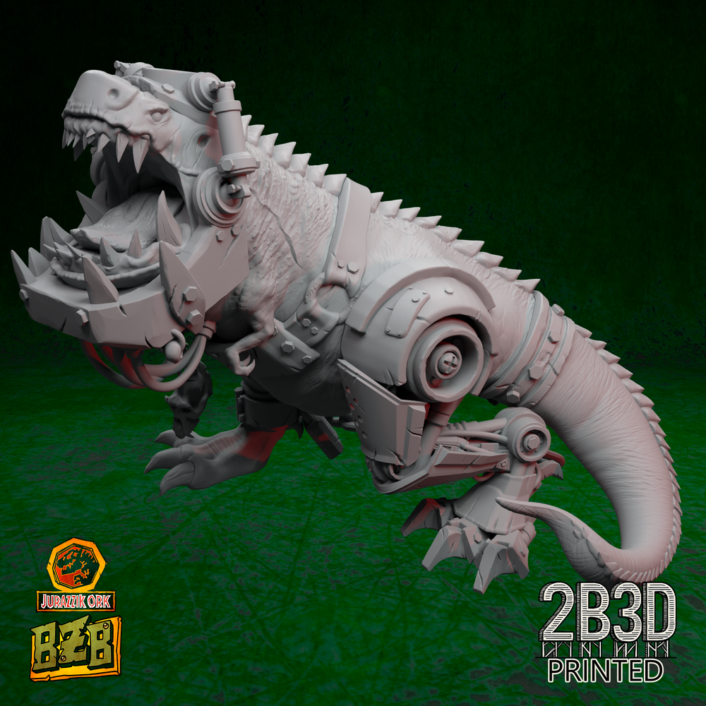 Squigosaurus 40K brings the Jurazzik beast into a grim, mechanical age. The sculpt fuses prehistoric muscle with battlefield hardware: riveted armor, throne mount, cable feeds, and spots for gob crews that fix problems by making them bigger. Display it as a wild monster or crown it with a warboss and goblin entourage for maximum spectacle.