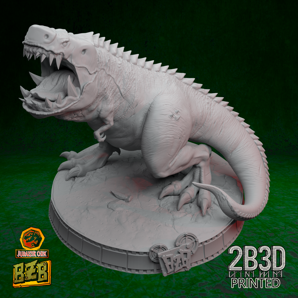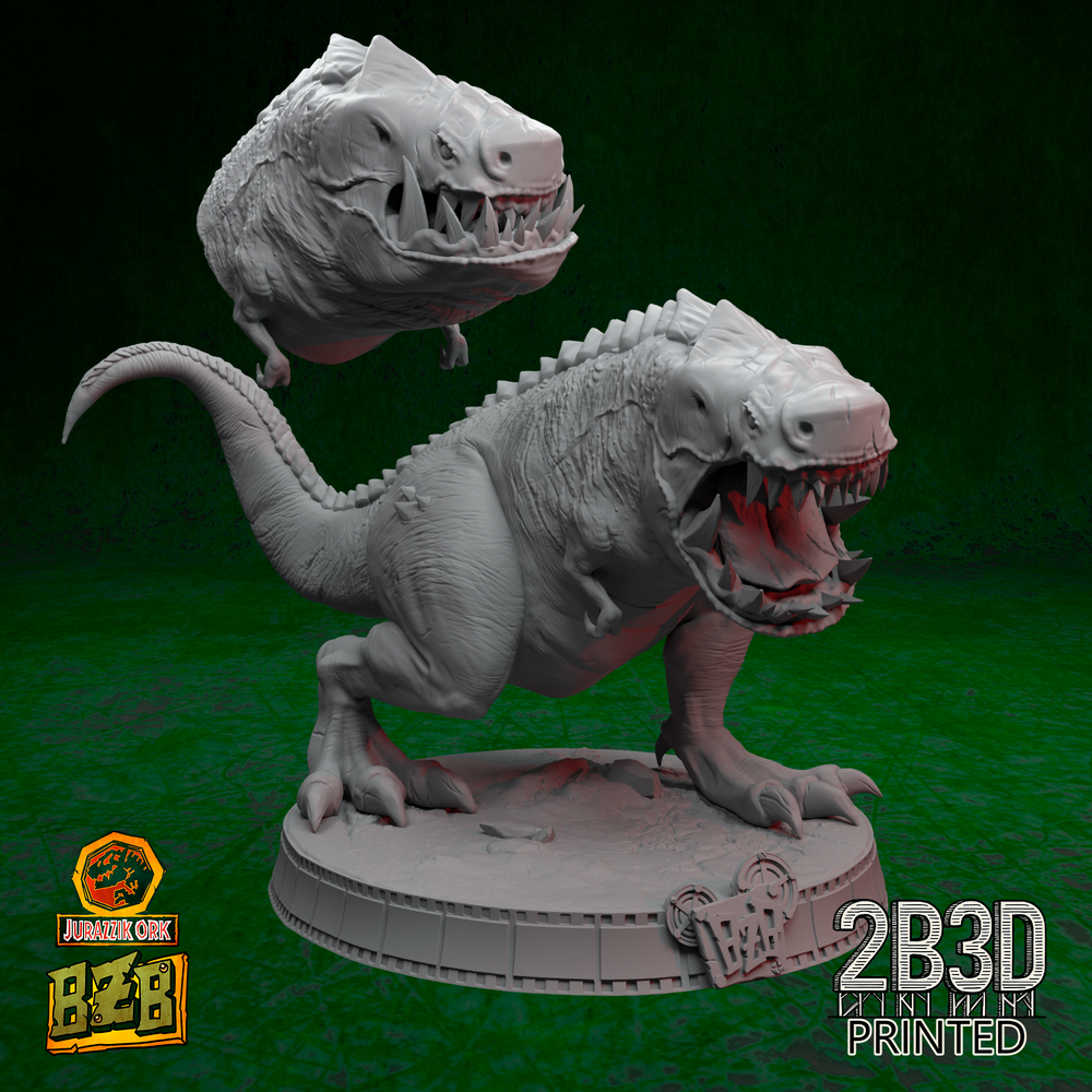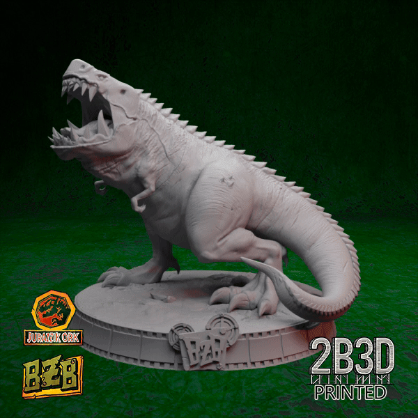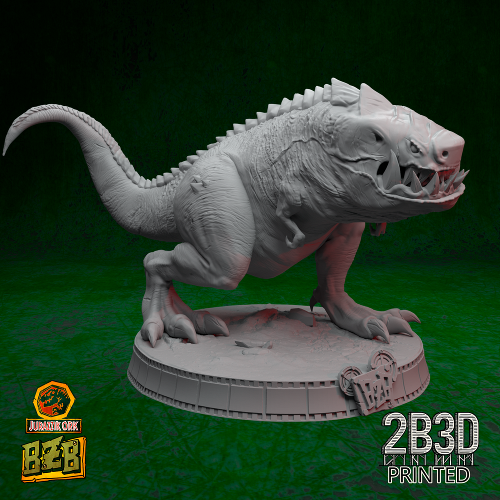 The sculpt explodes with prehistoric energy: scale-armored hide, roaring head, and a tail made for destruction. Whether displayed alone, with throne, or crewed by goblin mechanics and an ork boss, this creature dominates any display shelf.